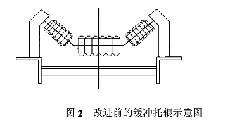 煤炭拋落沖擊力F對(duì)皮帶輸送機(jī)的破壞,主要表現(xiàn)在兩個(gè)方面:其一,由于拋落的煤炭對(duì)下部皮帶的沖擊,特別是大塊堅(jiān)硬煤巖對(duì)下部皮帶的沖擊,使下部皮帶承受皮帶的壽命下降;其二,使煤炭拋落位置下的托輥維修率加大。由于井下的實(shí)際使用條件及輸送要求,改變H、V、Q等都是受到多方面的限制的,因此在滿足實(shí)際運(yùn)輸要求的情況下,有必要對(duì)拋落位置下方的緩沖托輥進(jìn)行一系列的改進(jìn)設(shè)計(jì),以滿足實(shí)際要求,并消除或減少煤炭拋落沖擊力對(duì)皮帶及及托輥的危害。